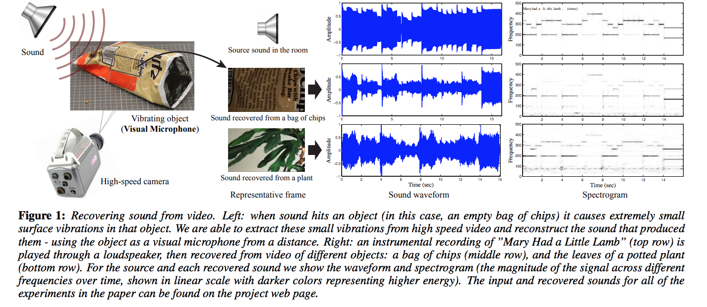 - “We show how, using only high-speed video of the object, we can extract those minute vibrations and partially recover the sound that produced them”