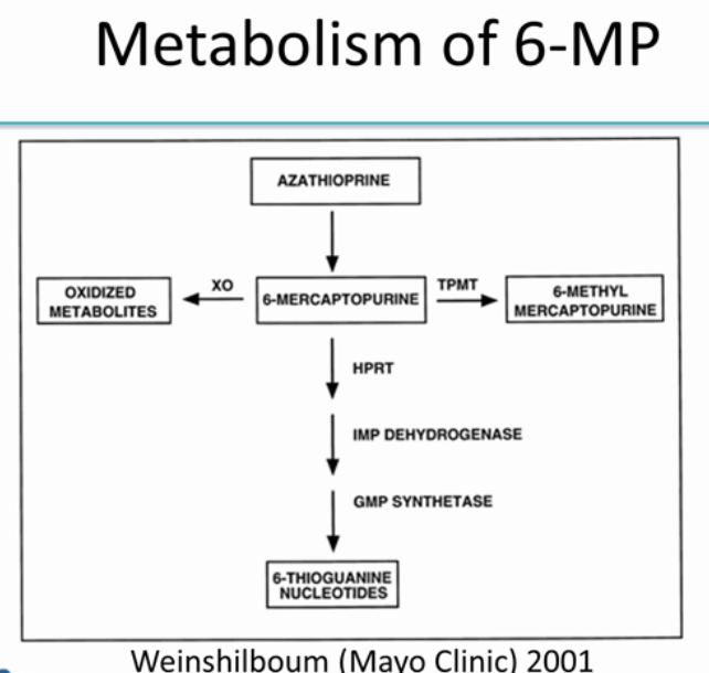 If you have TPMT, 6-MP gets converted into 6-methyl mercaptopurine, which is the inactive form of the drug.