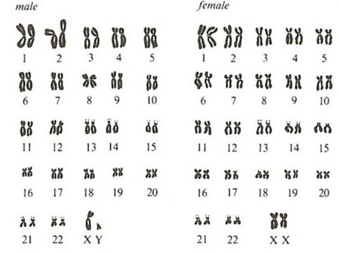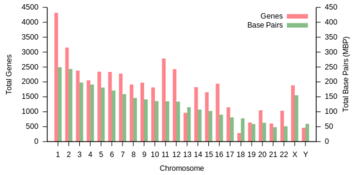 Each of us has 23 pairs of chromosomes. 22 are “autosomes” (non-sex chromosomes) and 1 is an “allosome” (sex-chromosome). Females are “XX”, and males are “XY”. The X chromosome has ~800 genes and just shy of 154 million bases, and the Y chromosome is significantly smaller, containing only ~50 genes and ~57 million bases.