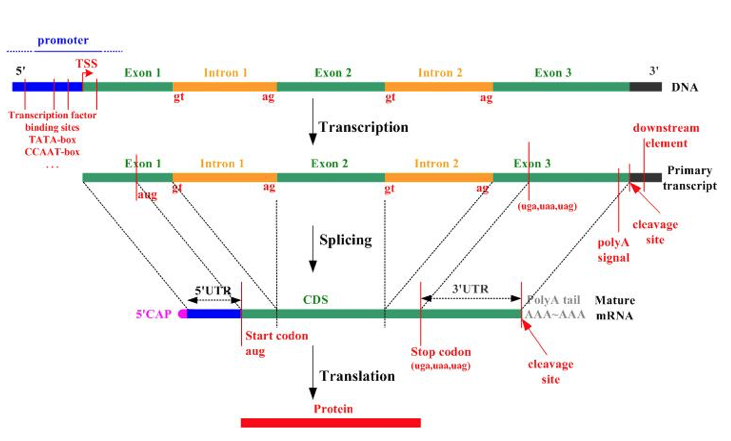 Part of the reason that the number of genes originally estimated was so far off, was because the idea of “alternative splicing” had not been discovered yet. One gene can turn into many proteins, by “splicing” or combining the introns and exons pictured below in different combinations.