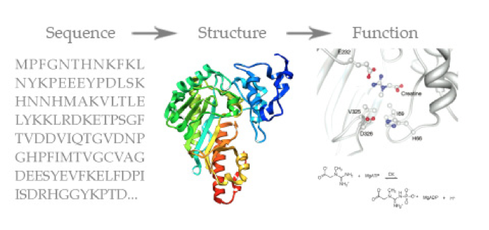 The DNA sequence gets parsed into an amino acid sequence, and the sequence of amino acids together form a chain (called a polypeptide or protein), and this protein’s shape (structure) is determined by it’s sequence. The structure of the protein then determines the function it will serve in the body (what other proteins will be able to fit/bind with it, etc).
