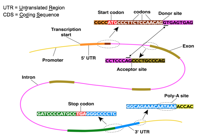 Exons - The ochre parts of the gene, exons are coding (turned into a protein).