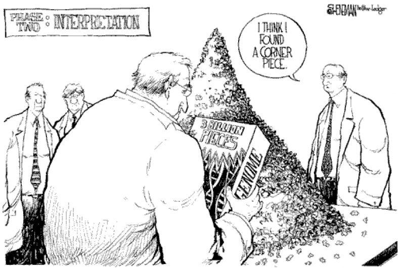 The human genome is 3 billion base pairs. Now that the human genome has been sequenced, the challenge that remains is interpretation. What do all these bases do? How do our genes confer health and disease?